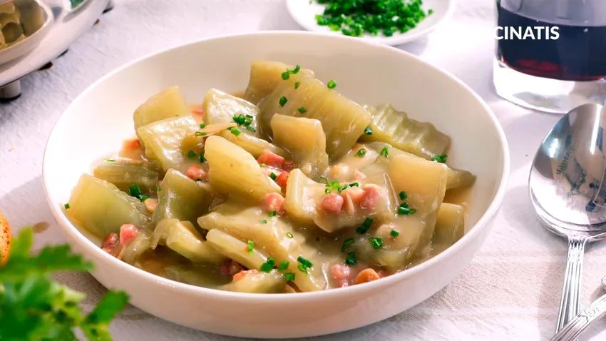 Prepara esta receta de cardo a la navarra, una receta tradicional de verduras acompañada con una salsa de jamón serrano y almendras laminadas crujientes.