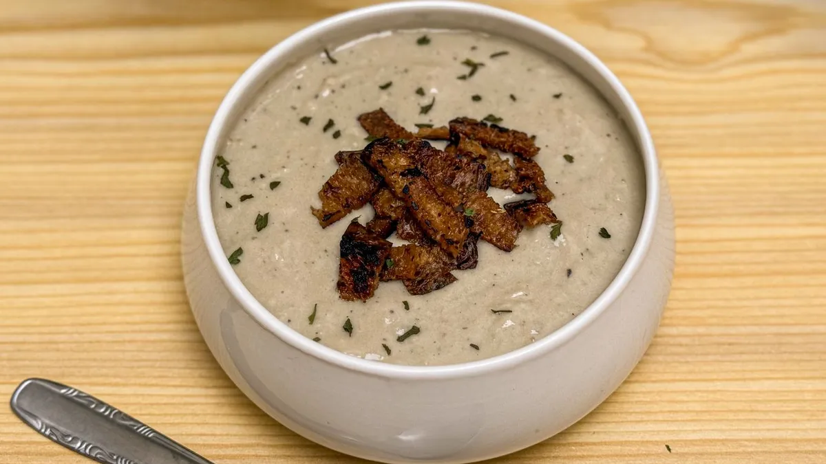 Sirve la crema y añade un toque crujiente por encima, en este caso unas láminas finas de seitán previamente frito en aceite.