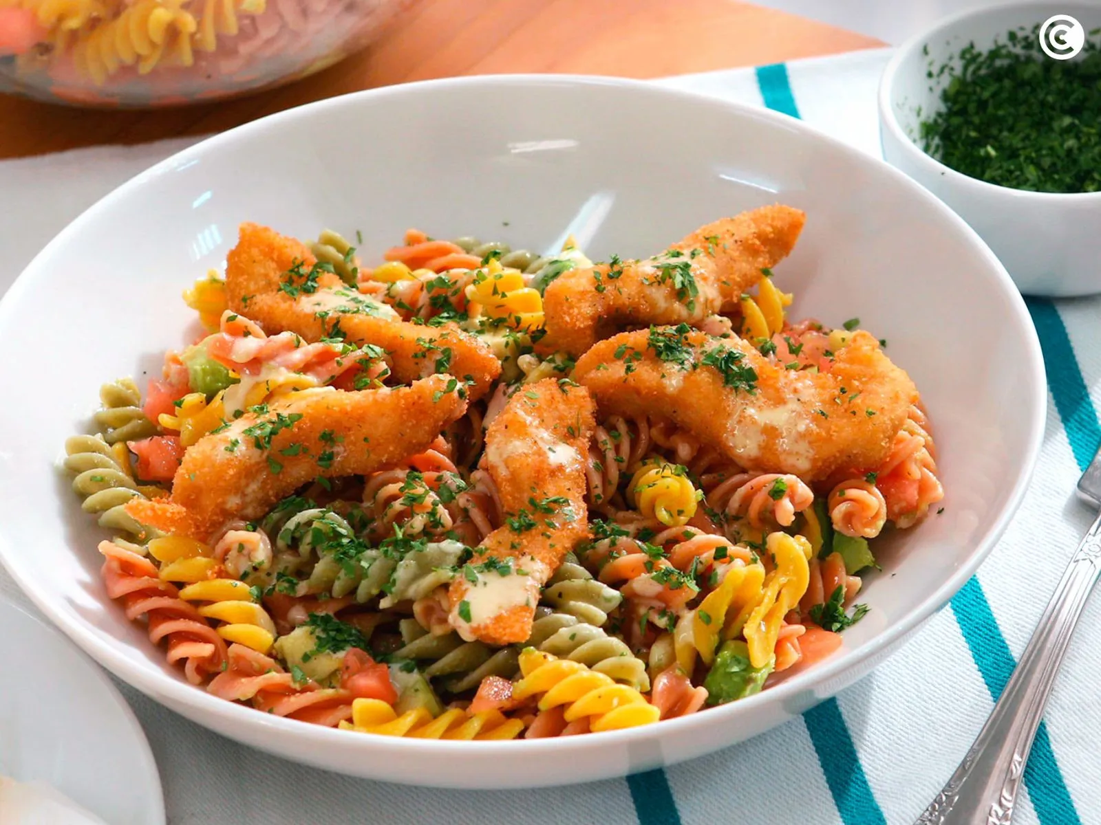 Para emplatar, sirve una ración de ensalada en el plato, añade unas tiras de pollo empanado y riega con la salsa de parmesano. Espolvorea perejil picado para decorar. Sirve la ensalada de pasta.