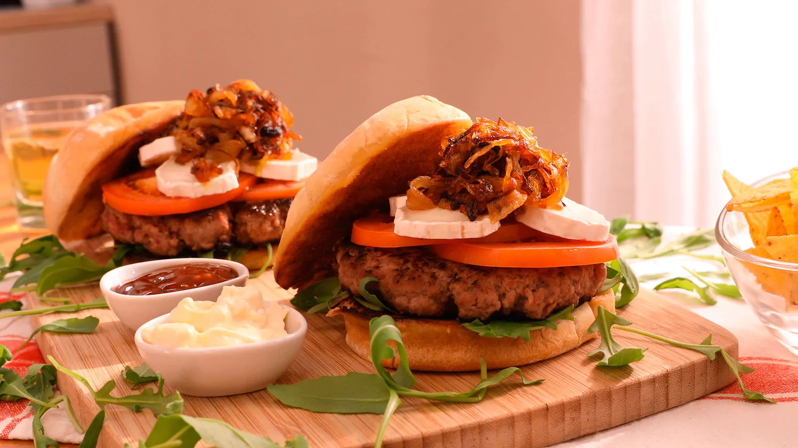 Disfruta de esta completa e irresistible hamburguesa de carne, rúcula, tomate, queso de cabra y deliciosa cebolla caramelizada con el toque crujiente del pan tostado.