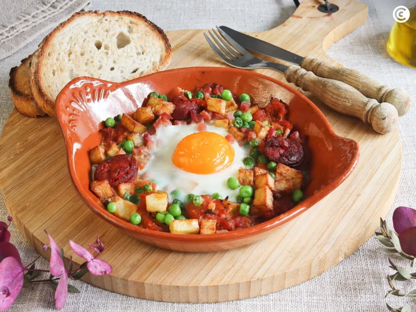 No existe una única versión, porque, como ocurre con tantas recetas tradicionales, cada casa los prepara a su manera. Sin embargo, todas comparten una base común que les da identidad: un buen sofrito con salsa de tomate y verduras, donde los guisantes suelen ser protagonistas, aunque no falten otros ingredientes que aportan aroma y textura. Sobre esta cama se colocan los huevos y el conjunto se lleva al horno en la clásica fuente de barro, que concentra los sabores y aporta ese toque tan característico.