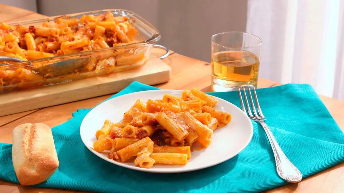 Macarrones con chorizo y queso gratinado