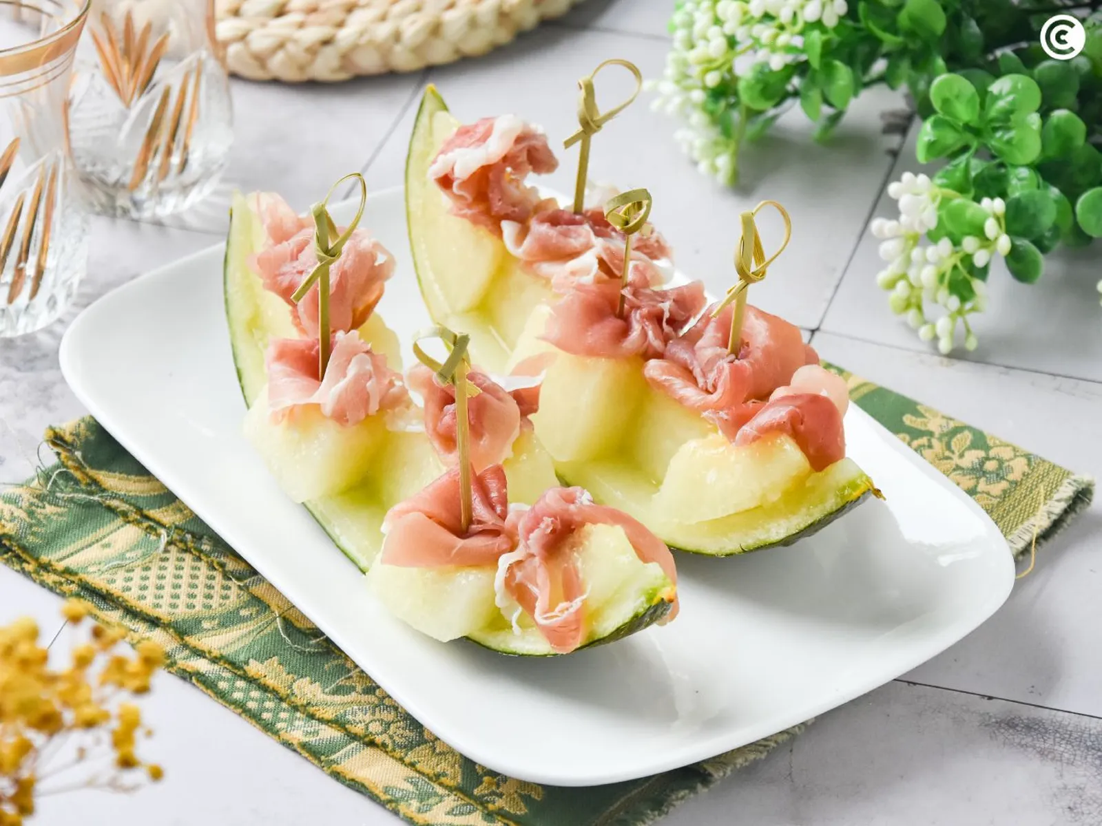 Una idea que nos encanta es usar bolas de melón en lugar de cortes tradicionales y ensartarlas con el jamón en brochetas. También puedes usar cortadores de galletas para formas divertidas.