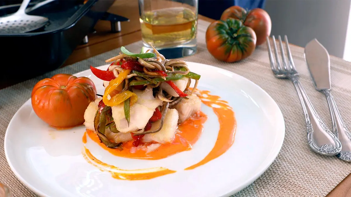 Prepara una sabrosa receta de merluza rellena de gulas y pimientos, un plato de pescado blanco que acompañamos con una salsa casera de pimientos del piquillo. ¡Insuperable!