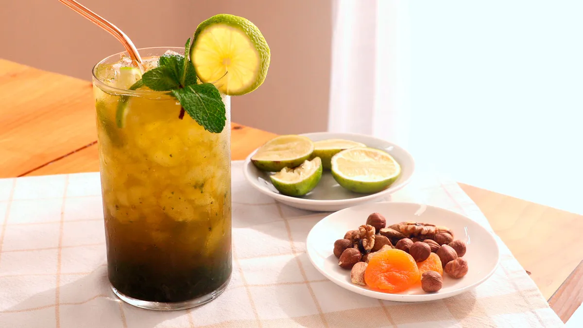 Para acabar el cóctel, añade un poco más de hielo, unas hojitas de menta, una rodaja de lima y la pajita.