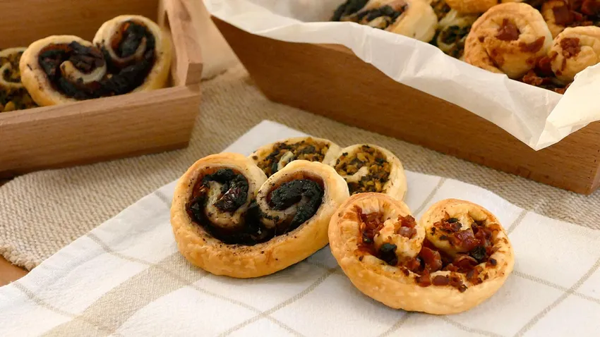 Receta fácil de originales palmeritas de hojaldre caseras con distintos rellenos salados. Picamos aceitunas, aprovechamos un original paté y combinamos el clásico jamón con tomate para hacer este sabroso aperitivo que podéis adaptar a los rellenos que más os gusten. ¡Fácil y rico!