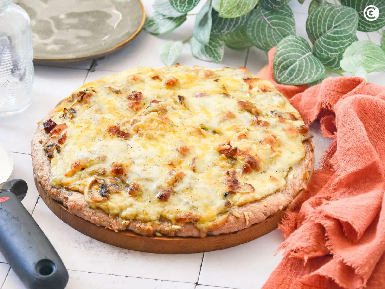 Combinamos la característica cremosidad y el sabor intenso de la clásica salsa carbonara con la textura crujiente de una buena base de pizza. Aunque en la receta original italiana la carbonara no lleva nata, esta versión en la que sí la incluimos es una adaptación más común fuera de Italia, ideal para conseguir el toque cremoso de manera sencilla incluso al horno.