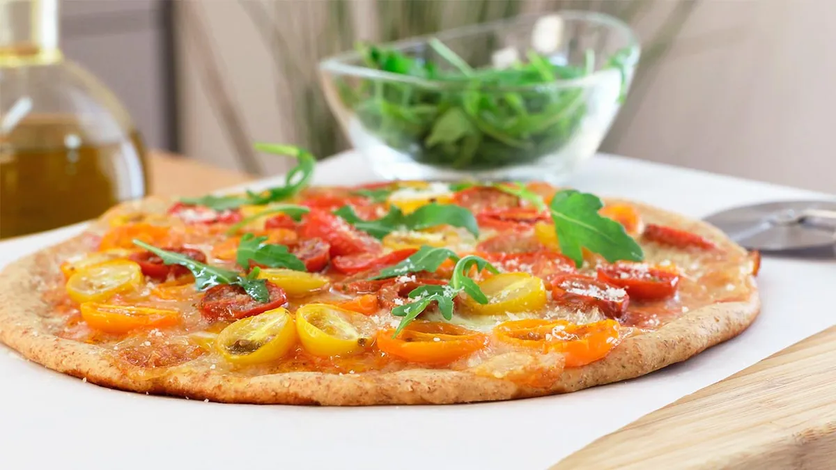 ¡Pizza integral 100% casera! Os enseñamos cómo hacer una pizza vegetariana con masa integral casera y verduras, tomates cherry, queso y rúcula.
