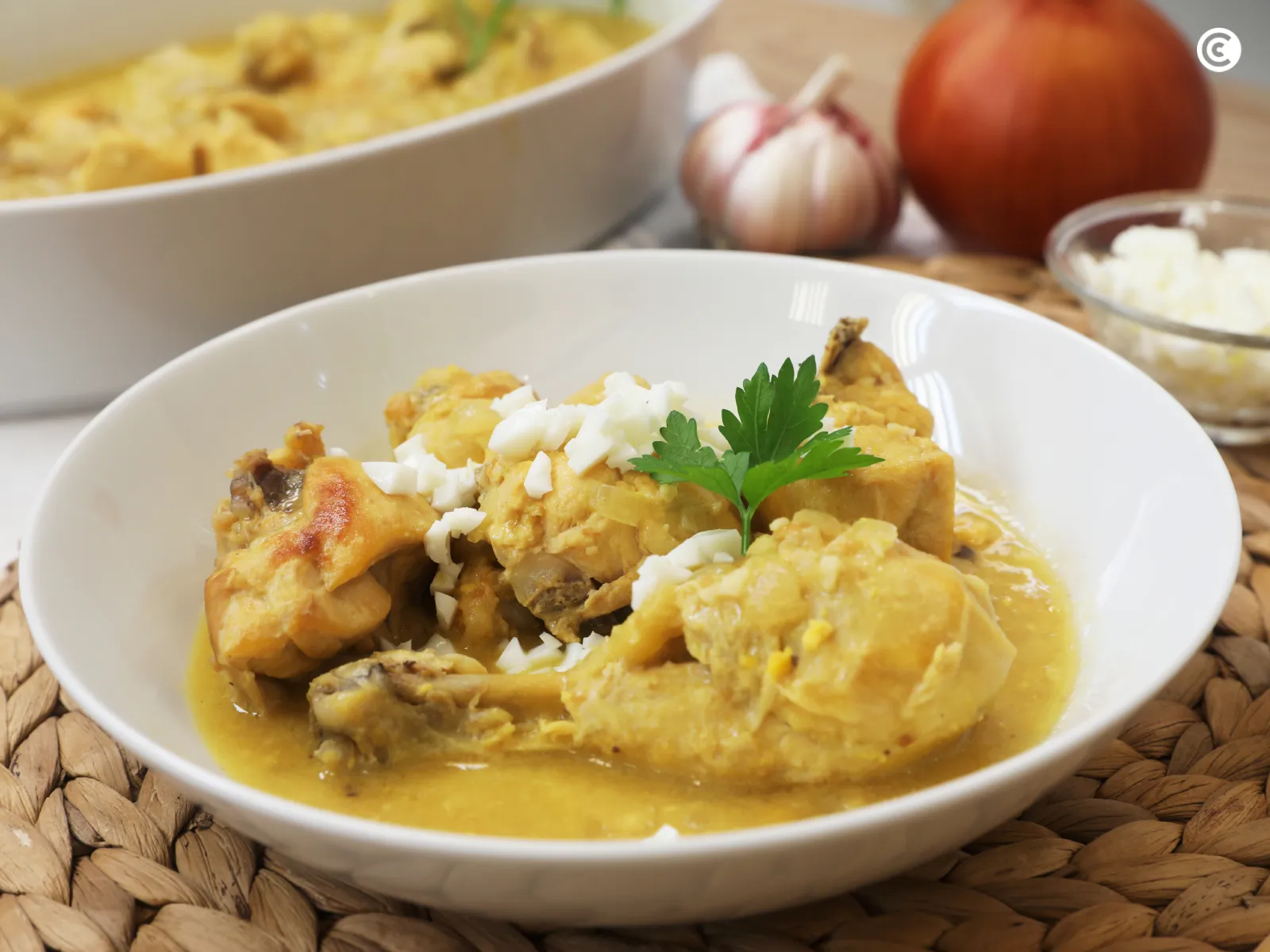 Sirve el pollo en pepitoria con una buena ración de salsa y aprovecha las claras de huevo para agregárselas por encima.