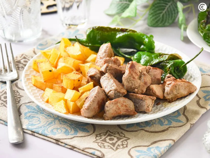 La receta tradicional del más jugoso raxo con patatas y pimientos de Padrón