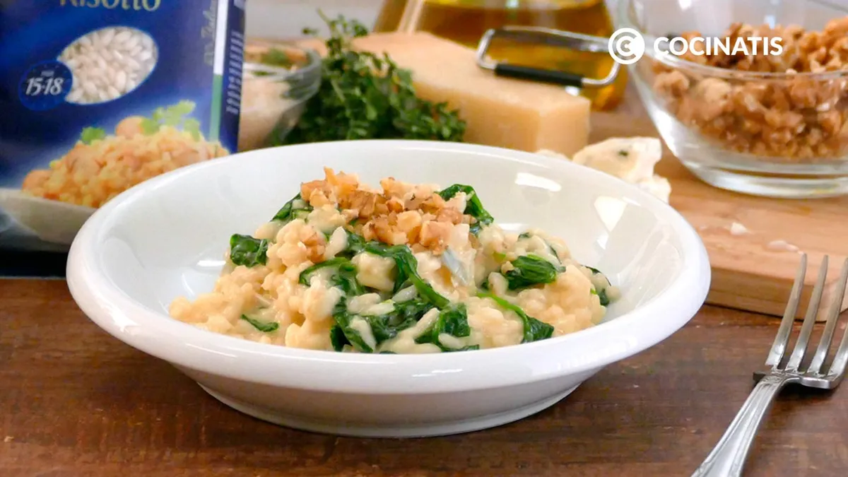 Risotto de queso con espinacas y nueces, una receta italiana de arroz cremoso