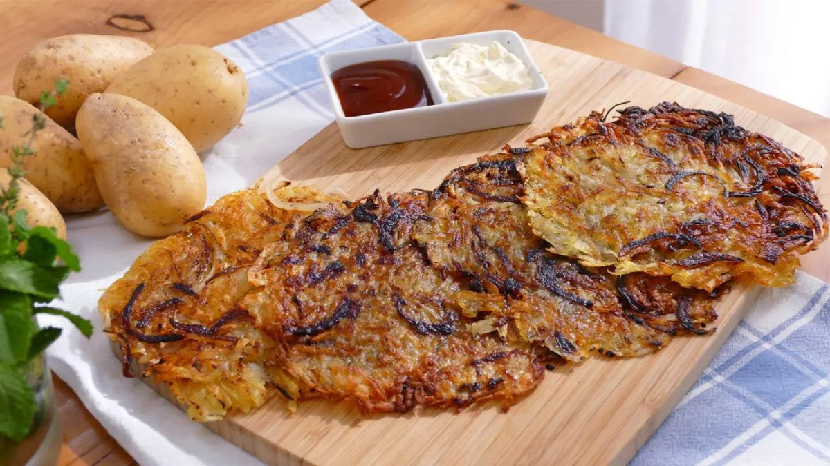 Rösti de patata, receta de Suiza que se sirve como acompañamiento de carnes y verduras.