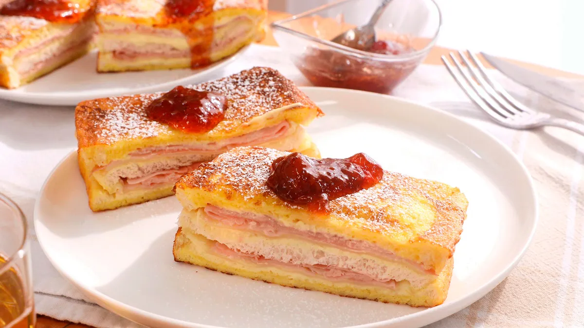 Sirve el sándwich Montecristo, espolvorea con azúcar glas y acompaña con un poco de mermelada de frambuesa.