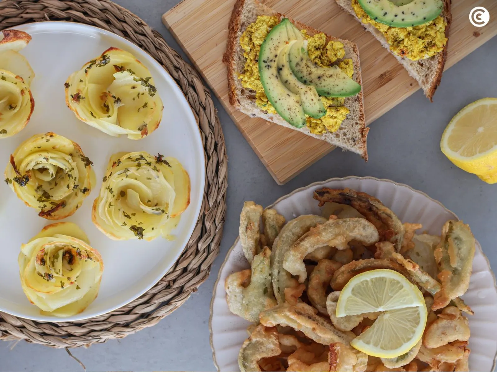 Las siguientes tapas veganas combinan sencillez y mucho sabor: rosas de patata con ajo y perejil, rabas de la huerta y una tapa de tofu revuelto con aguacate. Todas ellas son realmente fáciles de preparar, las preparamos con ingredientes sencillos y, lo importante, resultan ideales para disfrutar tanto en una cena informal como para sorprender con un picoteo en cualquier celebración.
