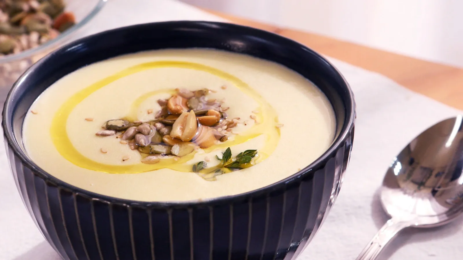 Sirve la vichyssoise con un chorrito de aceite de oliva y añade unas semillas y pipas variadas en el centro del plato. Decorando con una ramita de tomillo y ya puedes disfrutar de esta deliciosa crema fría de puerros.